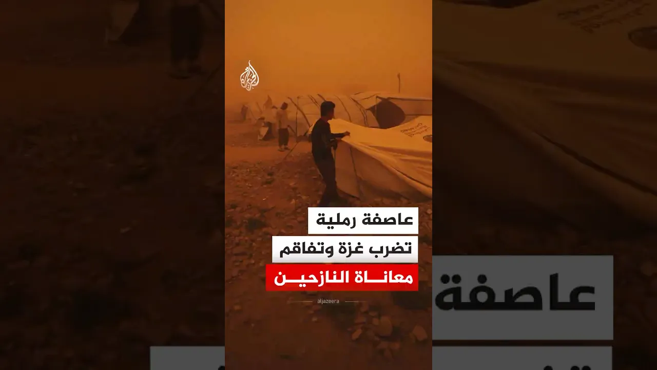 "عاصفة رملية تضرب قطاع غزة، السبت، وتحول السماء إلى اللون البرتقالي، ما زاد من معاناة مئات آلاف النازحين الذين يعيشون في خيام متهالكة ومراكز إيواء مؤقتة بعد الدمار الواسع الذي خلّفته الحرب الإسرائيلية.