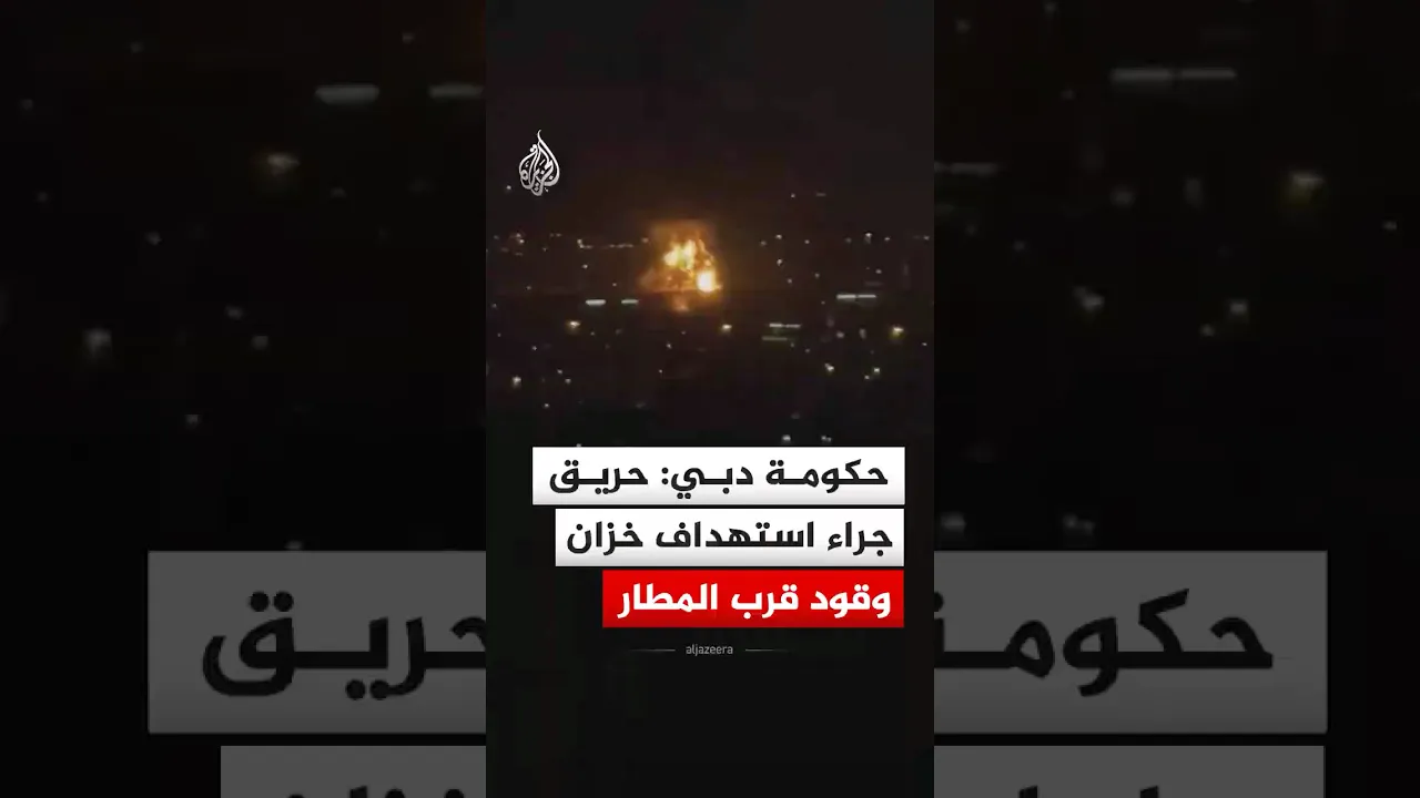 المكتب الإعلامي لحكومة دبي يفيد باندلاع حريق قرب مطار دبي الدولي جراء استهداف خزان وقود بطائرة مسيرة.