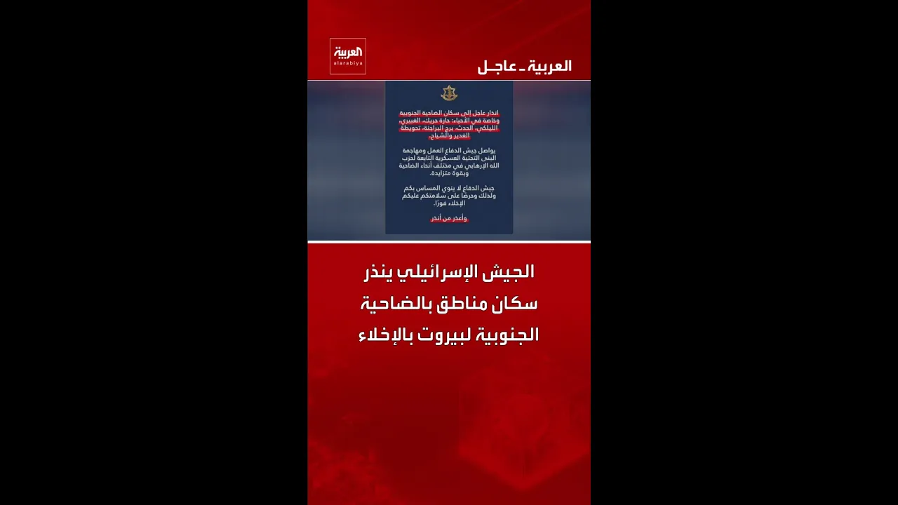 الجيش الإسرائيلي ينذر سكان مناطق بالضاحية الجنوبية لبيروت بالإخلاء