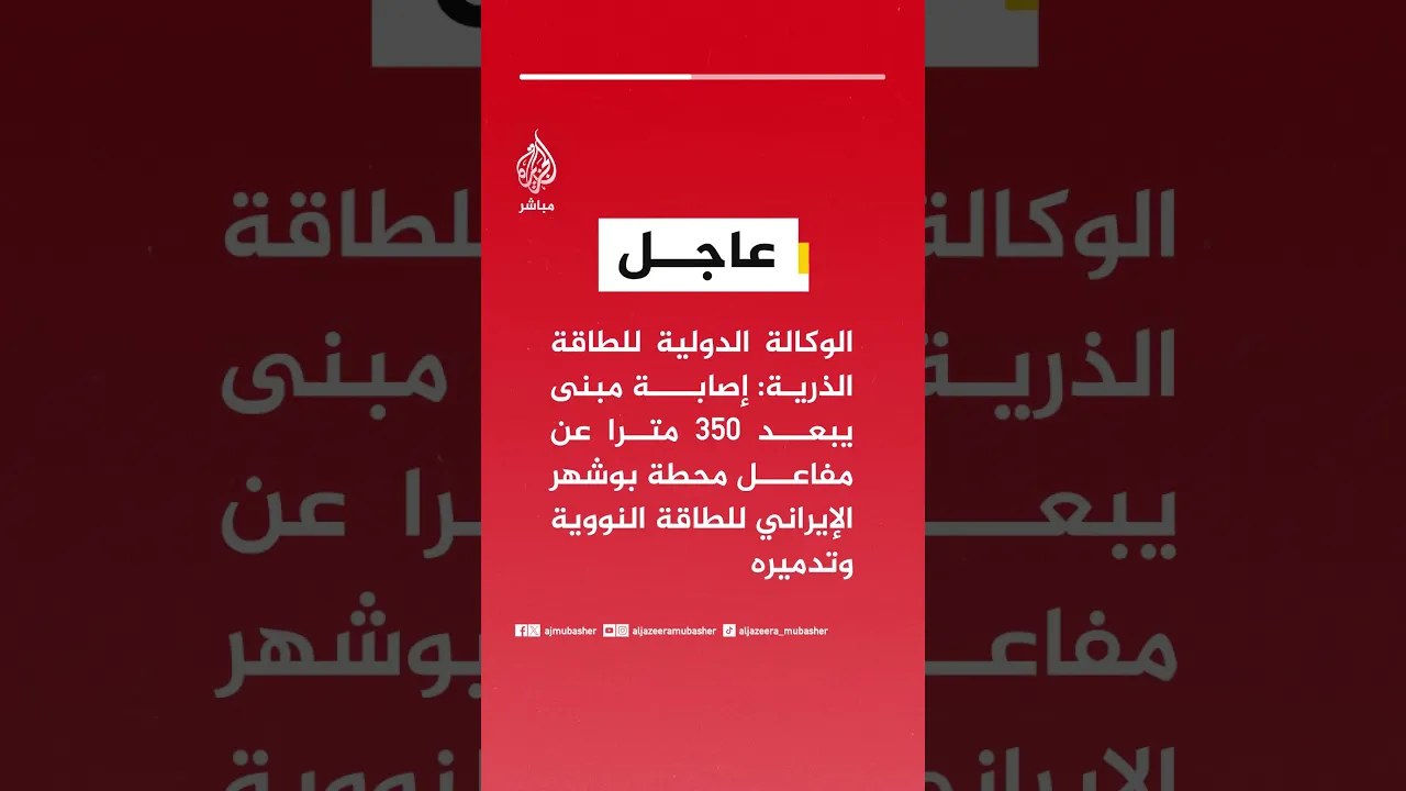 عاجل | الوكالة الدولية للطاقة الذرية: إصابة مبنى يبعد 350 مترا عن مفاعل محطة بوشهر الإيراني للطاقة النووية وتدميره