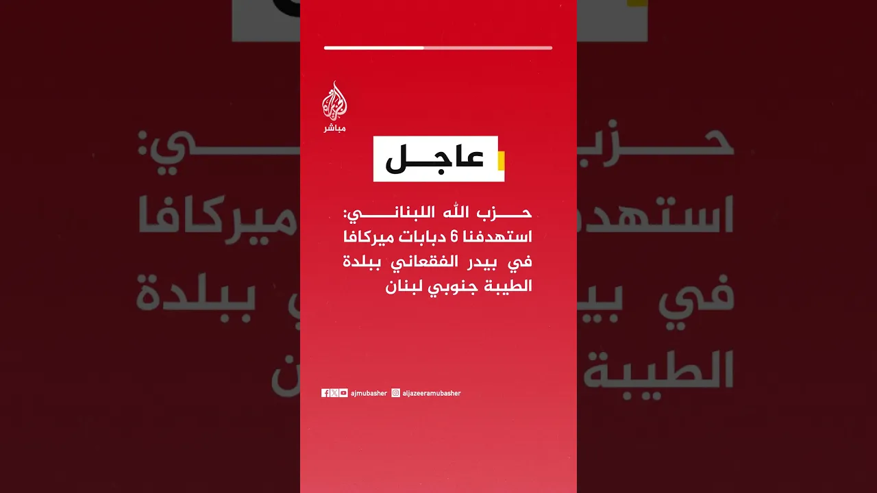 عاجل | حزب الله اللبناني: استهدفنا 6 دبابات ميركافا في بيدر الفقعاني ببلدة الطيبة جنوبي #لبنان
