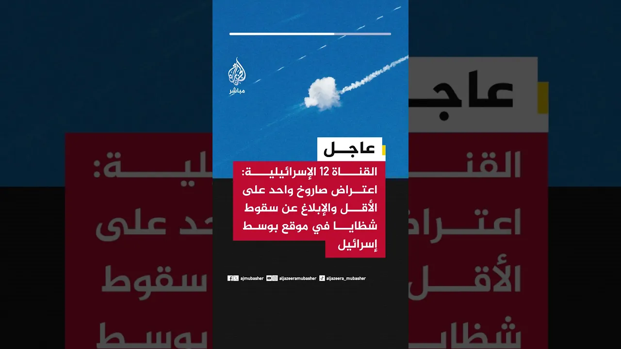 عاجل | القناة 12 الإسرائيلية: اعتراض صاروخ واحد على الأقل والإبلاغ عن سقوط شظايا في موقع بوسط إسرائيل