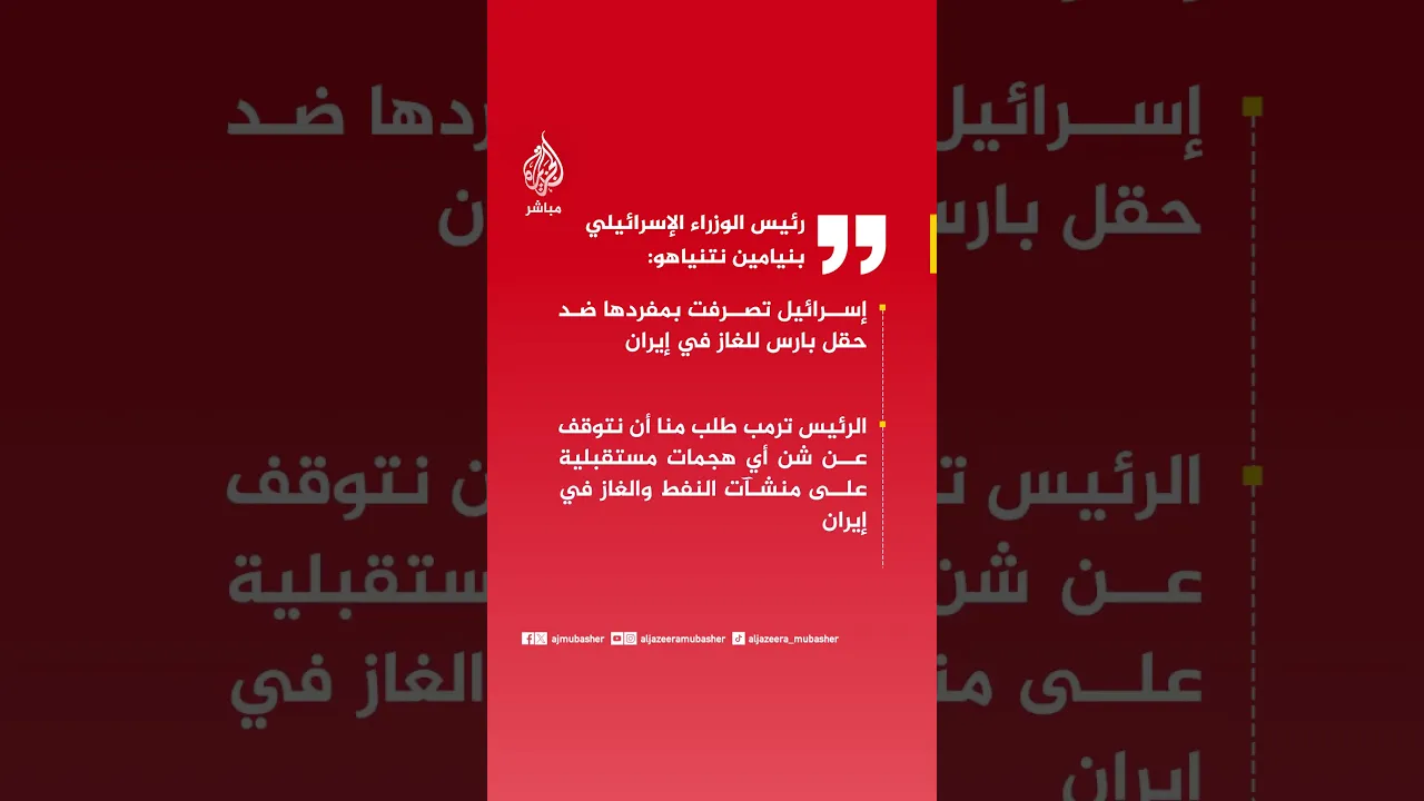 رئيس الوزراء الإسرائيلي بنيامين نتنياهو: إسرائيل تصرفت بمفردها ضد حقل بارس للغاز في إيران