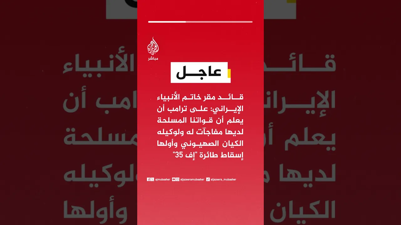 عاجل | قائد مقر خاتم الأنبياء الإيراني: على ترامب أن يعلم أن قواتنا المسلحة لديها مفاجآت له ولوكيله الكيان الصهيوني وأولها إسقاط طائرة "إف 35"