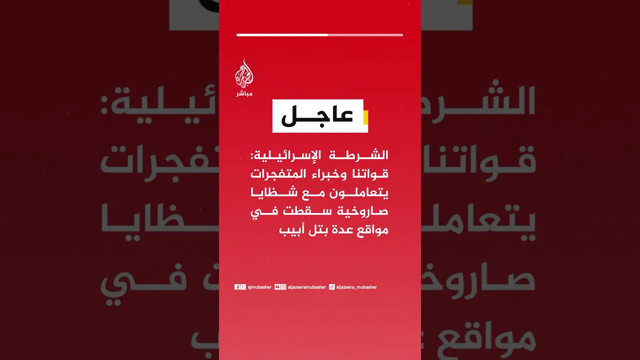 عاجل | الشرطة الإسرائيلية: قواتنا وخبراء المتفجرات يتعاملون مع شظايا صاروخية سقطت في مواقع عدة بتل أبيب