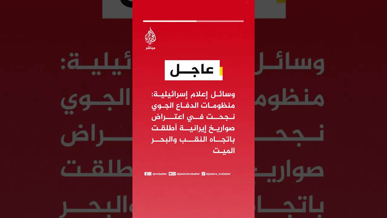 عاجل | وسائل إعلام إسرائيلية: منظومات الدفاع الجوي نجحت في اعتراض صواريخ إيرانية أطلقت باتجاه النقب والبحر الميت