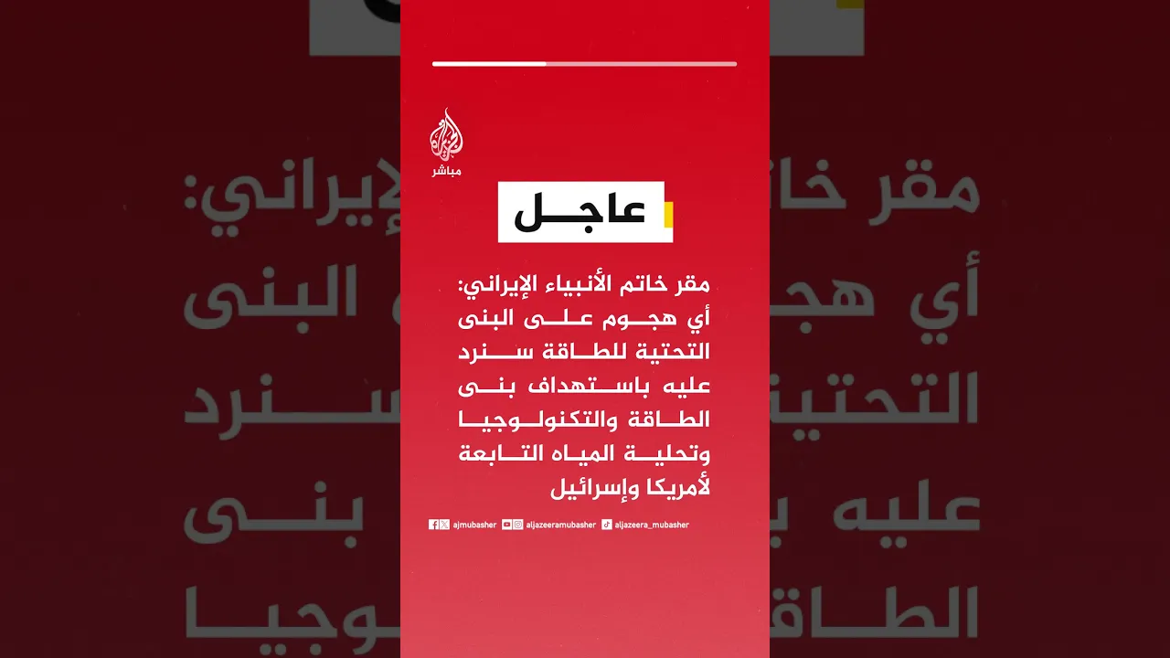 عاجل | مقر خاتم الأنبياء الإيراني: أي هجوم على البنى التحتية للطاقة في إيران سنرد عليه باستهداف بنى الطاقة والتكنولوجيا وتحلية المياه التابعة لأمريكا وإسرائيل في المنطقة