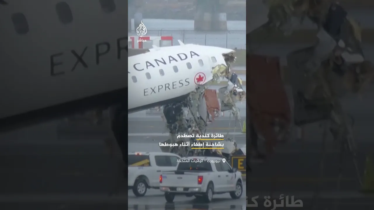 لحظة اصطدام طائرة كندية بشاحنة إطفاء أثناء هبوطها على مدرج مطار لاغوارديا في نيويورك الأمريكية في الحادثة التي أدت إلى مقتل طيارين اثنين وإصابة العشرات