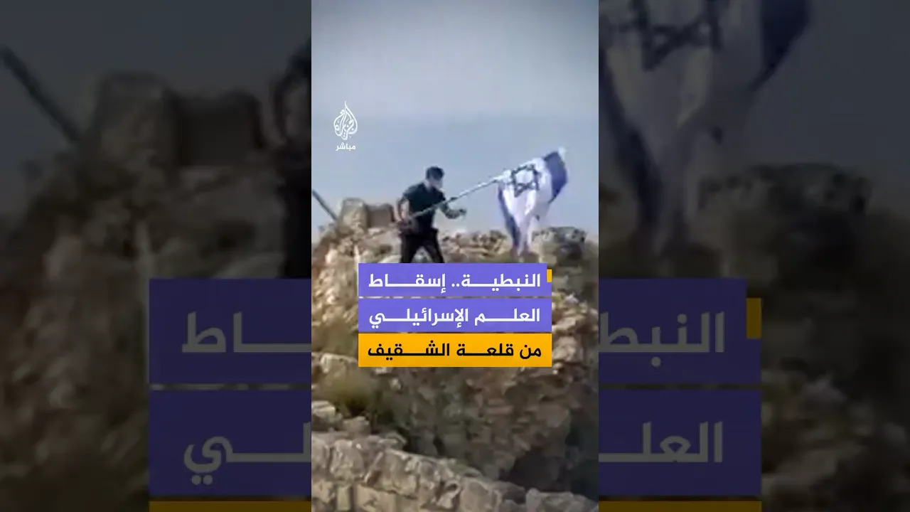 لحظة قيام شاب لبناني بإسقاط العلم الإسرائيلي من أعلى قلعة الشقيف في قضاء النبطية جنوبي لبنان