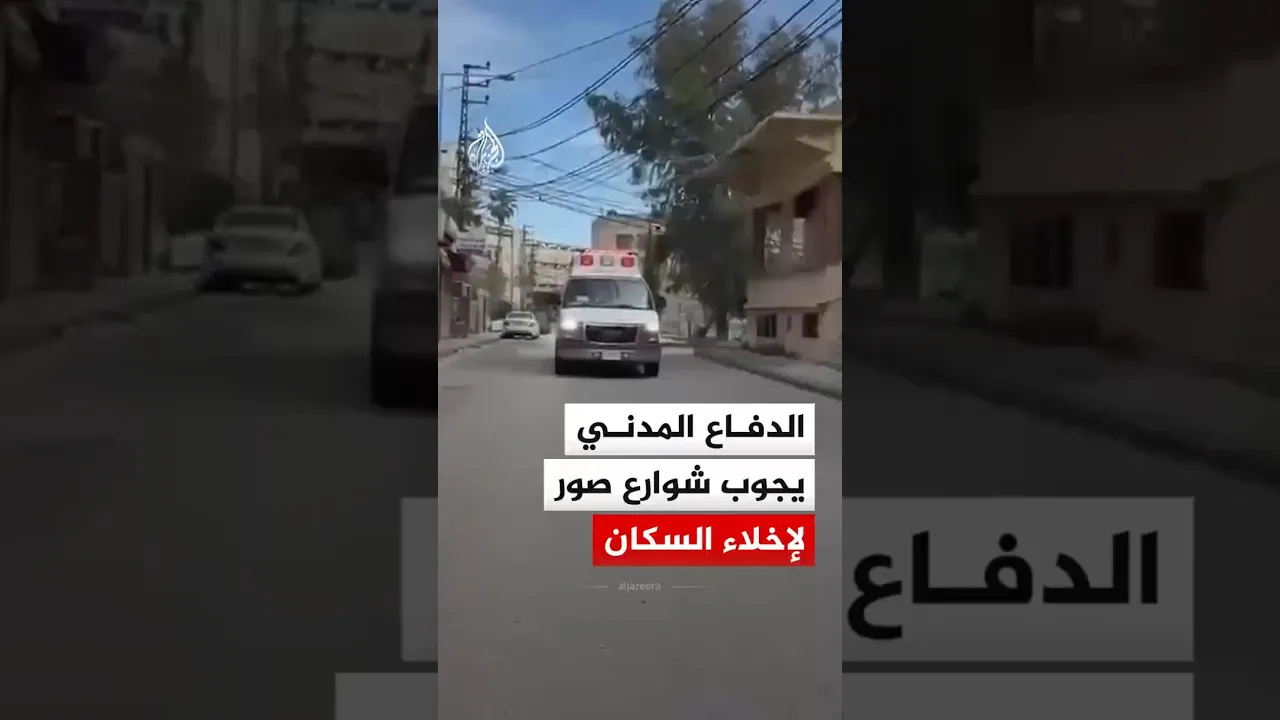 فرق الدفاع المدني تجوب شوارع صور جنوبي لبنان بمكبرات الصوت لدعوة السكان إلى الإخلاء الفوري الثلاثاء، عقب إنذارات عاجلة أصدرها الجيش الإسرائيلي لسكان صور ومعشوق.