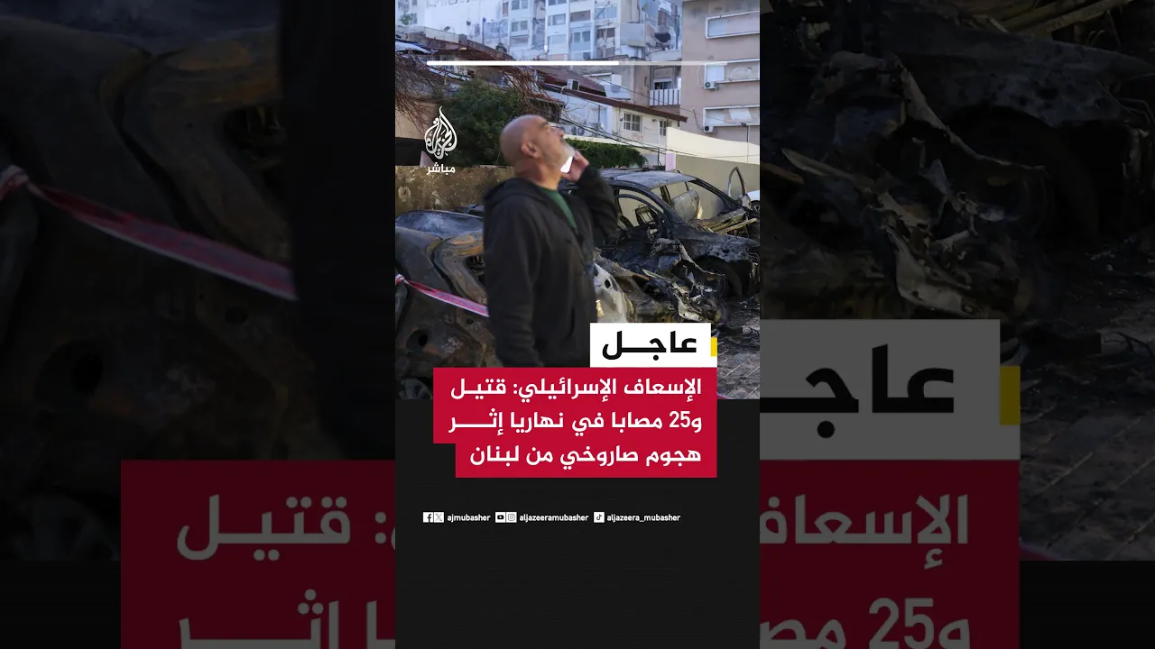 عاجل | الإسعاف الإسرائيلي: قتيل و25 مصابا في نهاريا إثر هجوم صاروخي من #لبنان