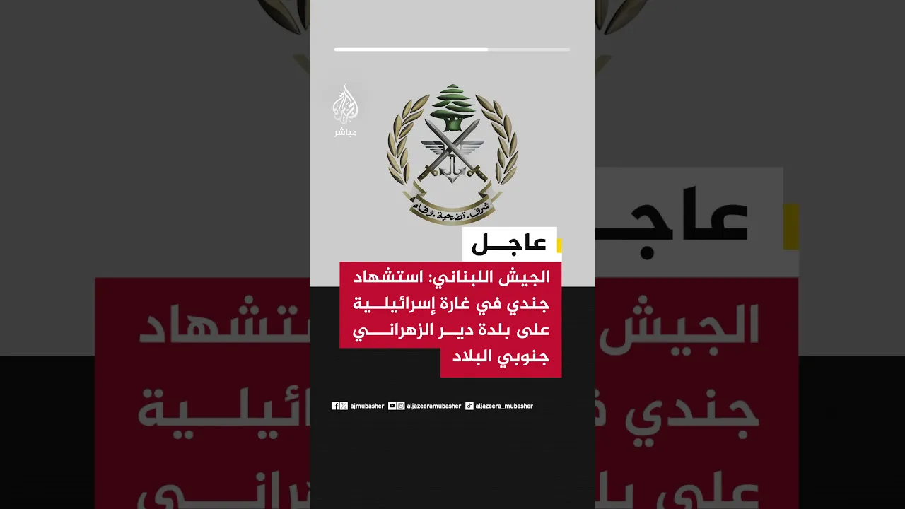 عاجل | الجيش اللبناني: استشهاد جندي في غارة إسرائيلية على بلدة دير الزهراني جنوبي البلاد
