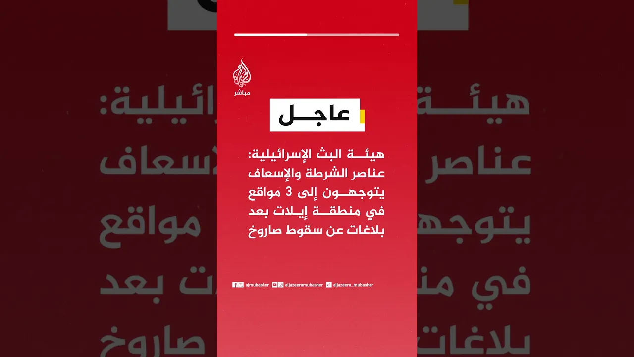 عاجل | هيئة البث الإسرائيلية: عناصر الشرطة والإسعاف يتوجهون إلى 3 مواقع في منطقة #إيلات بعد بلاغات عن سقوط صاروخ