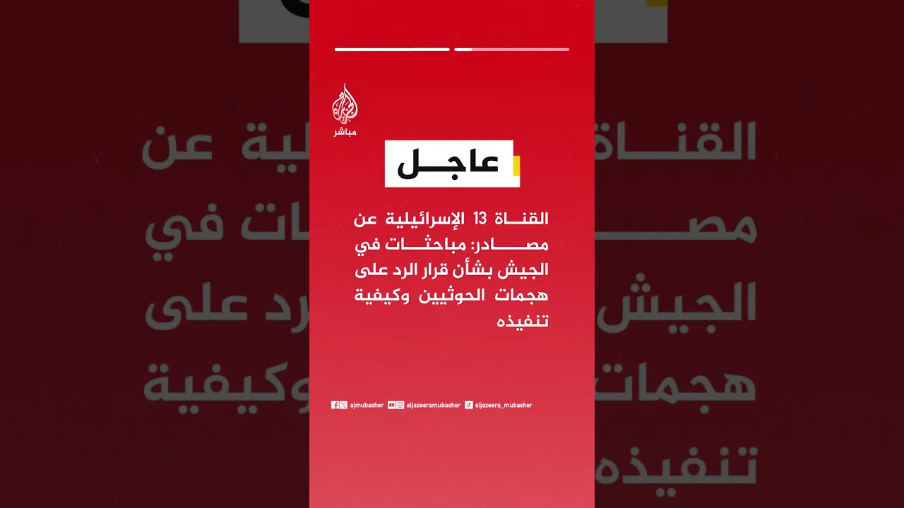 🟥  القناة ١٣ الإسرائيلية عن مصادر: مباحثات في الجيش بشأن قرار الرد على هجمات الحوثيين وكيفية تنفيذه