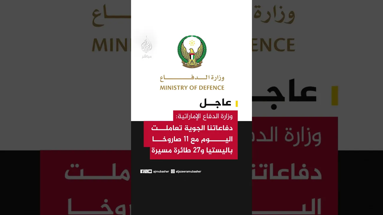 عاجل | وزارة الدفاع الإماراتية: دفاعاتنا الجوية تعاملت اليوم مع 11 صاروخا باليستيا و27 طائرة مسيرة