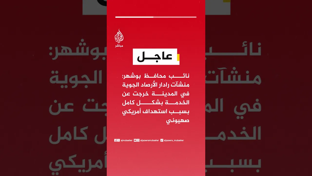 عاجل | نائب محافظ بوشهر: منشآت رادار الأرصاد الجوية في المدينة خرجت عن الخدمة بشكل كامل بسبب استهداف أمريكي صهيوني