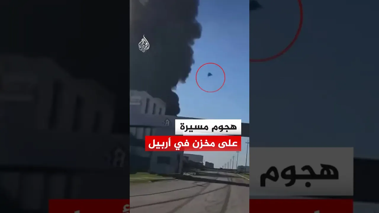 كاميرا توثق لحظة انقضاض طائرة مسيرة على مخزن لزيوت السيارات، أثناء احتراقه بعد هجوم مسيرة أخرى في أربيل بكردستان العراق