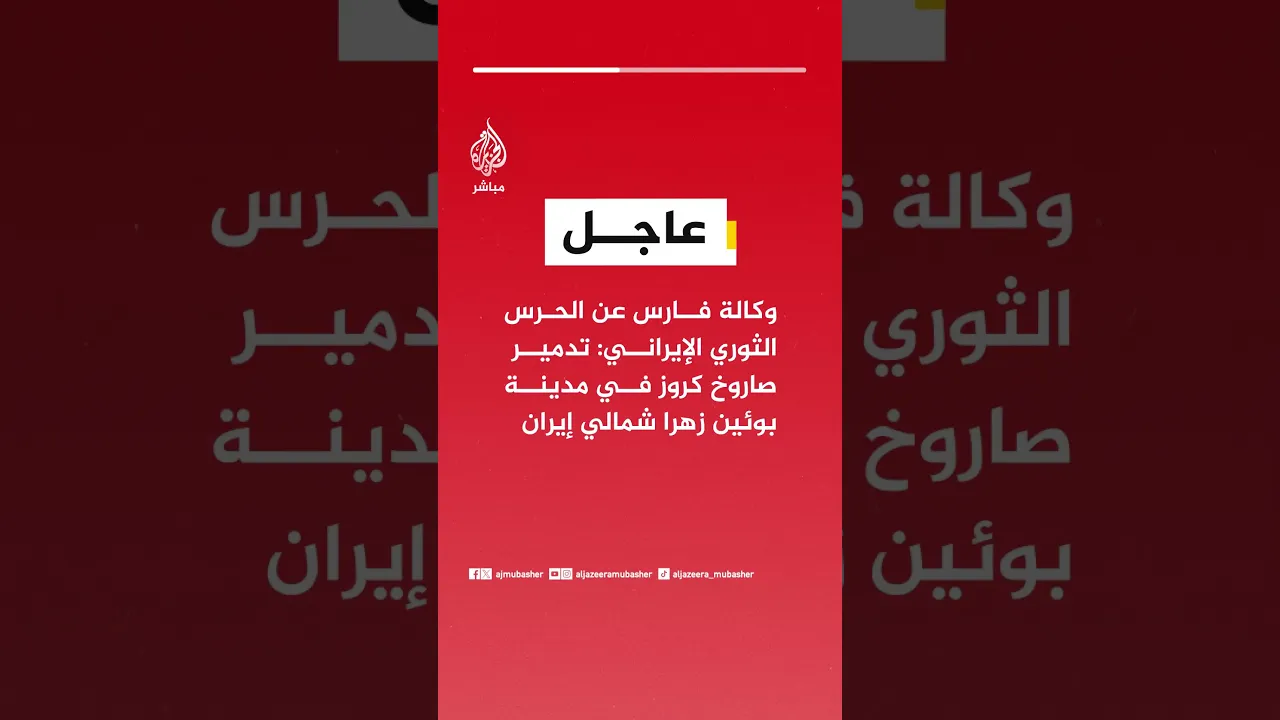 عاجل | وكالة فارس عن الحرس الثوري الإيراني: تدمير صاروخ كروز في مدينة بوئين زهرا شمالي إيران