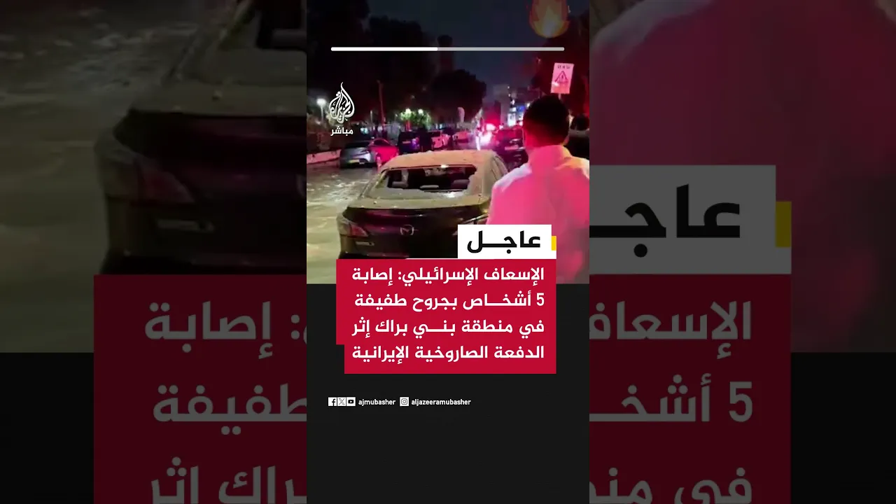 عاجل | الإسعاف الإسرائيلي: إصابة 5 أشخاص بجروح طفيفة في منطقة بني براك إثر الدفعة الصاروخية الإيرانية