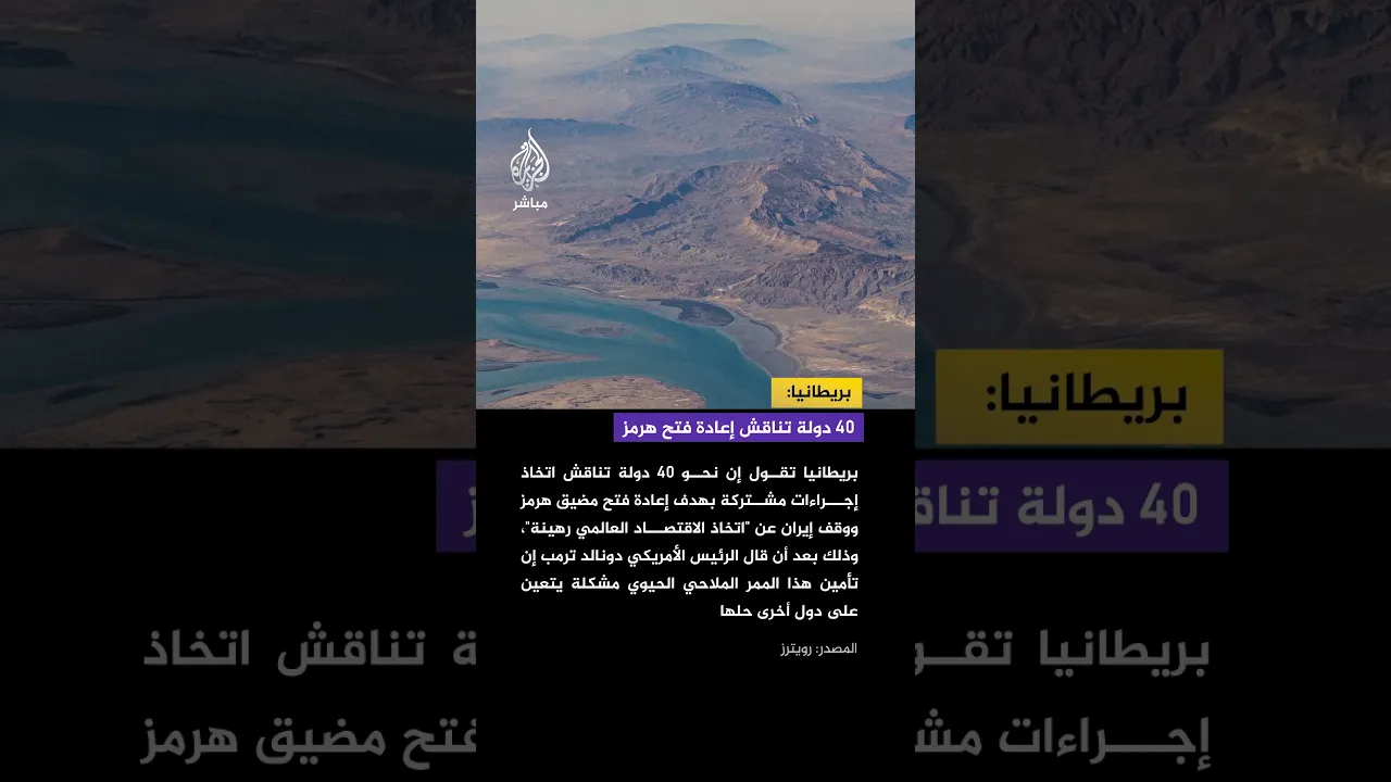 #بريطانيا تقول إن نحو 40 دولة تناقش اتخاذ إجراءات مشتركة بهدف إعادة فتح #مضيق_هرمز