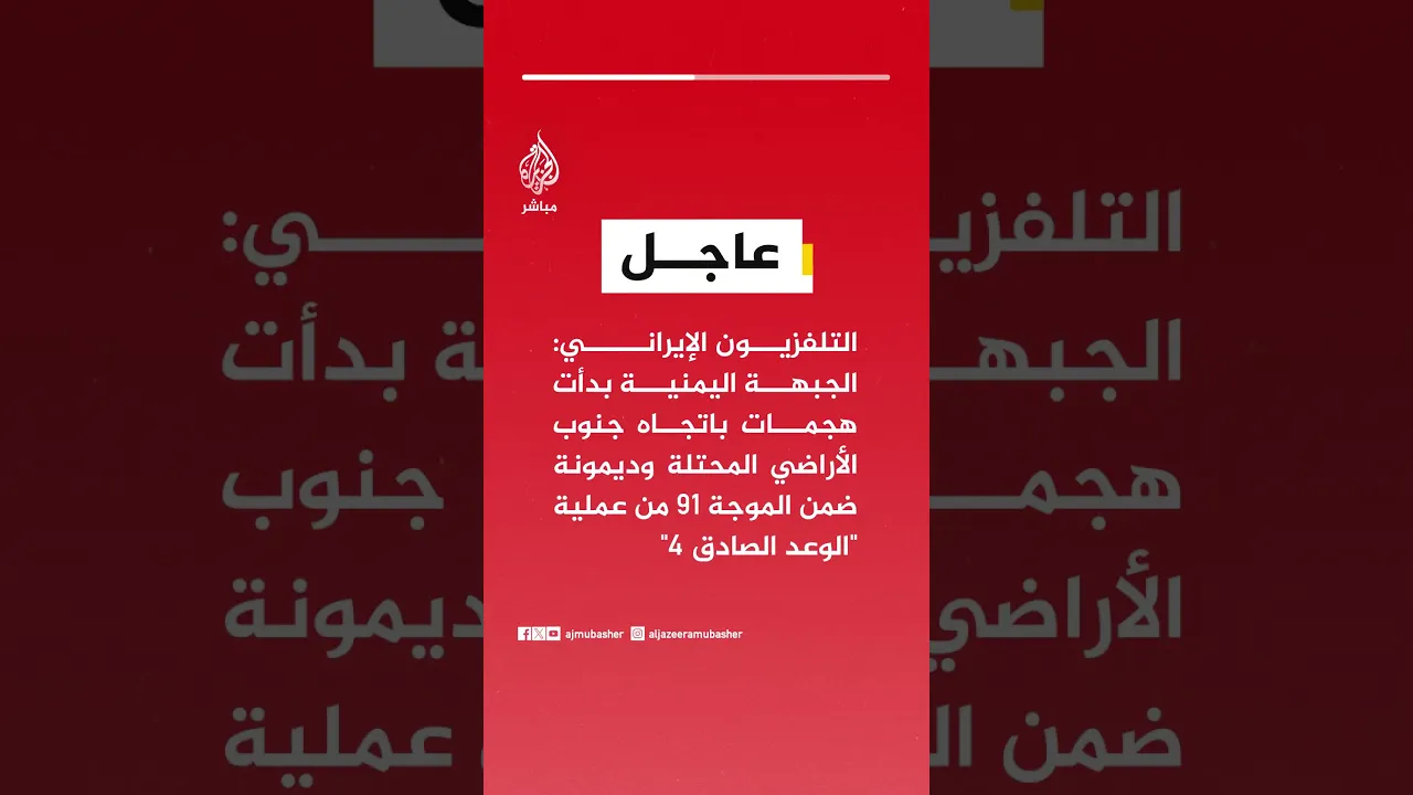 عاجل | التلفزيون الإيراني: الجبهة اليمنية بدأت هجمات باتجاه جنوب الأراضي المحتلة وديمونة ضمن الموجة 91 من عملية "الوعد الصادق 4"
