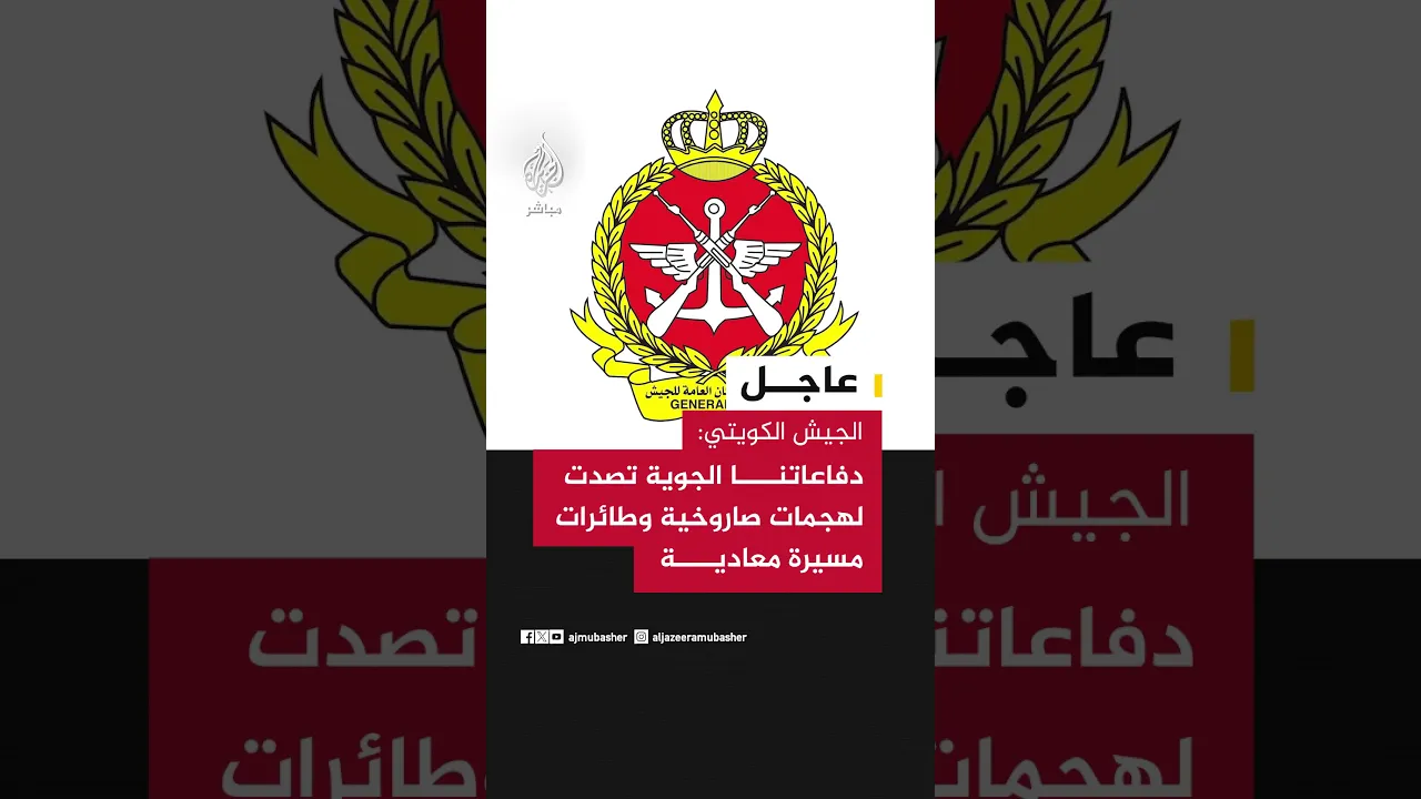 عاجل | الجيش الكويتي: دفاعاتنا الجوية تصدت لهجمات صاروخية وطائرات مسيرة معادية