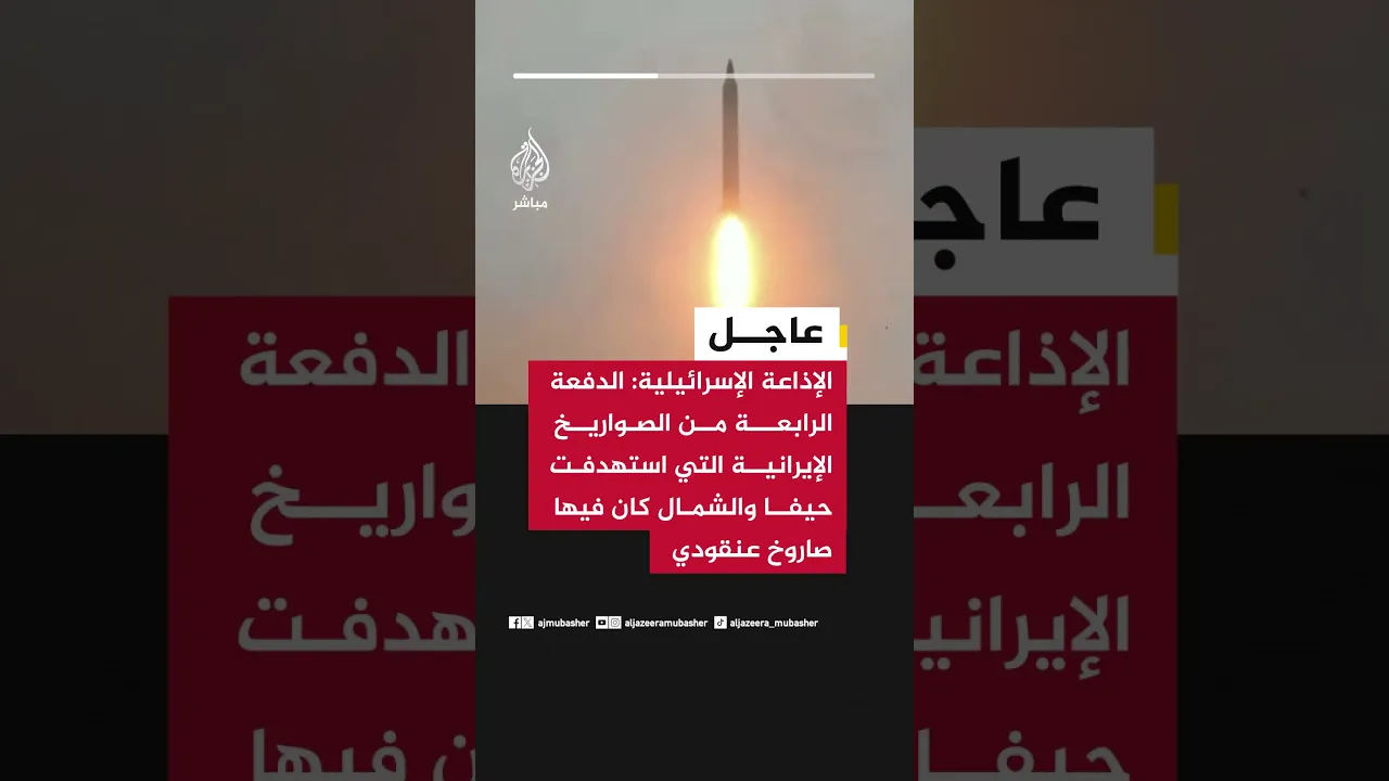 عاجل | الإذاعة الإسرائيلية: الدفعة الرابعة من الصواريخ الإيرانية التي استهدفت حيفا والشمال كان فيها صاروخ عنقودي