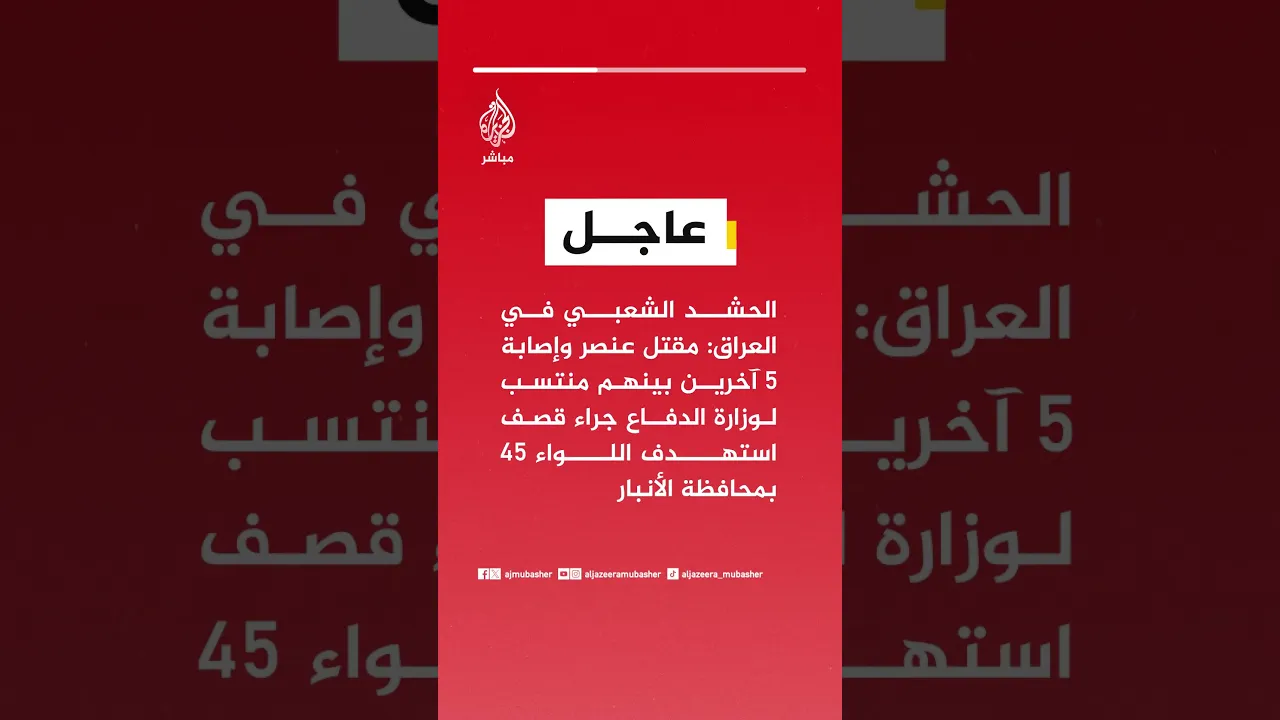 عاجل | الحشد الشعبي في العراق: مقتل عنصر وإصابة 5 آخرين بينهم منتسب لوزارة الدفاع جراء قصف استهدف اللواء 45 بمحافظة الأنبار
