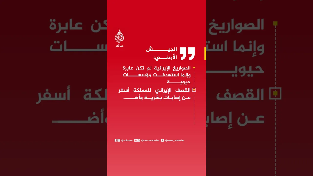 عاجل | الجيش الأردني: اعترضنا 261 صاروخا وطائرة مسيرة منذ بدء الحرب ولم نتمكن من اعتراض 20 صاروخا وطائرة مسيرة