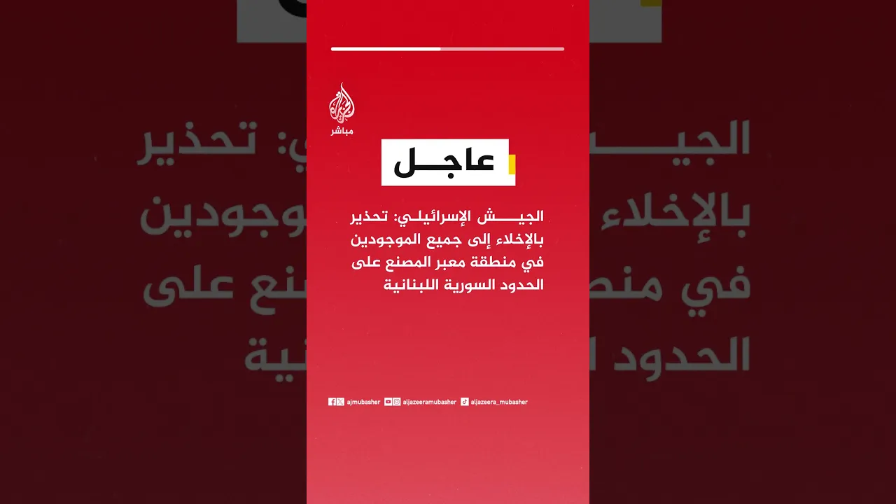 عاجل | الجيش الإسرائيلي: تحذير بالإخلاء إلى جميع الموجودين في منطقة معبر المصنع على الحدود السورية اللبنانية
