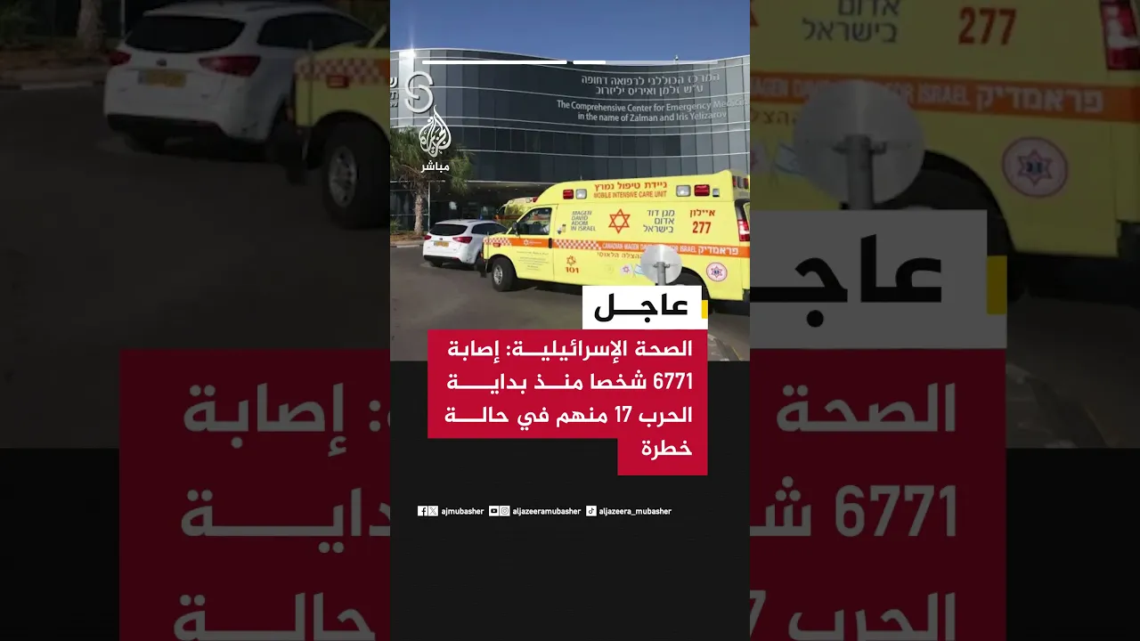 عاجل | الصحة الإسرائيلية: إصابة 6771 شخصا منذ بداية الحرب 2 منهم في حالة حرجة جدا و15 حالتهم خطرة