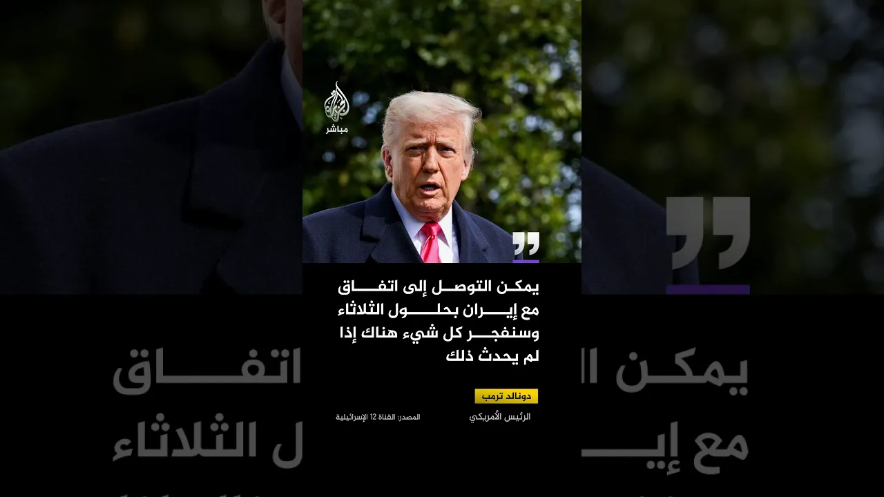 ترمب للقناة 12 الإسرائيلية: يمكن التوصل إلى اتفاق مع إيران بحلول يوم الثلاثاء وإذا لم يحدث ذلك فسوف نفجر كل شيء هناك