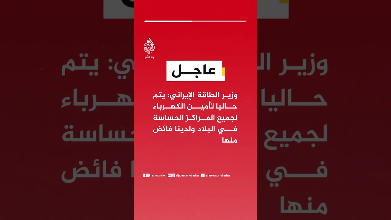 عاجل | وزير الطاقة الإيراني: يتم حاليا تأمين الكهرباء لجميع المراكز الحساسة في البلاد ولدينا فائض منها