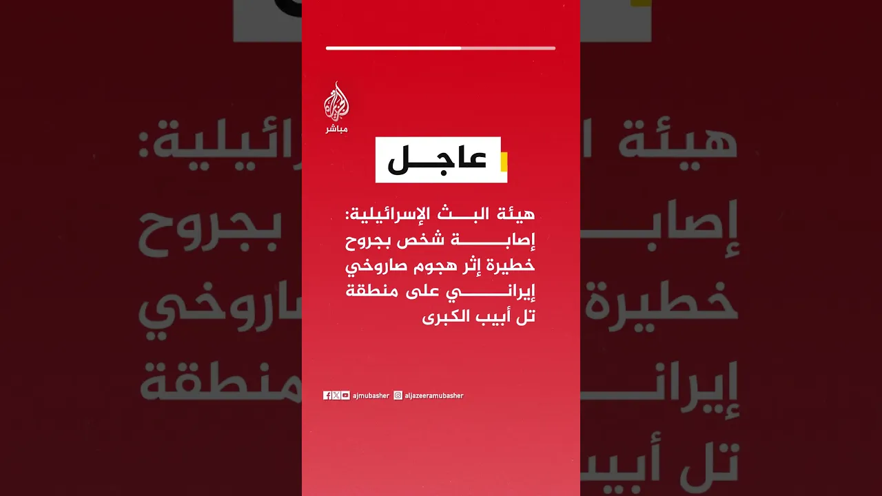 عاجل | هيئة البث الإسرائيلية: إصابة شخص بجروح خطيرة إثر هجوم صاروخي إيراني على منطقة تل أبيب الكبرى