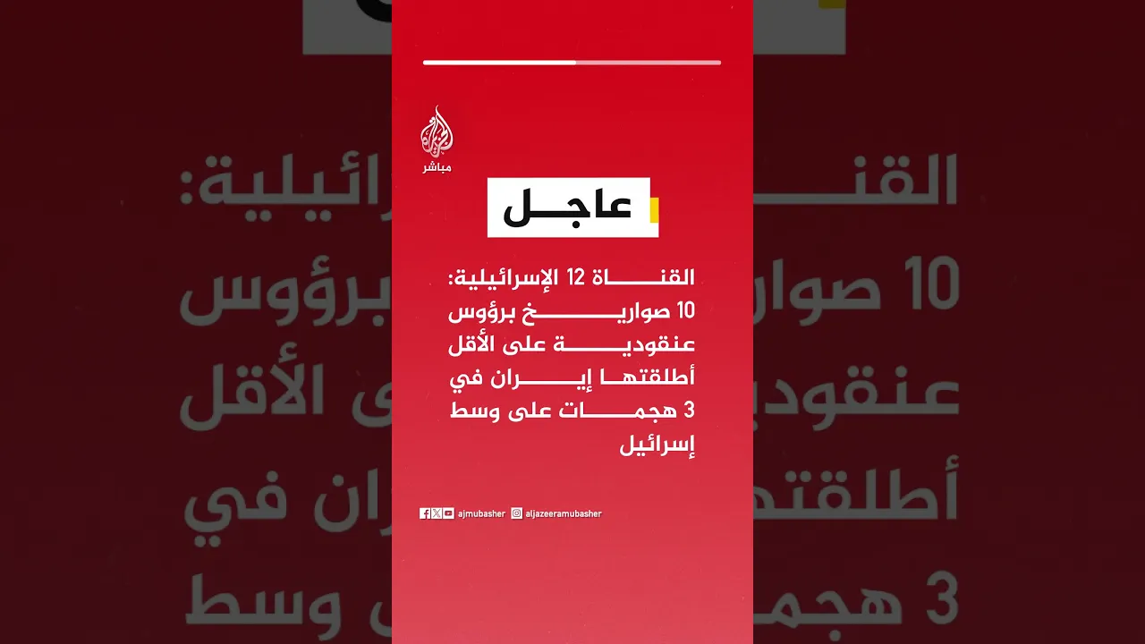 عاجل | القناة ١٢ الإسرائيلية: 10 صواريخ برؤوس عنقودية على الأقل أطلقتها إيران في 3 هجمات على وسط إسرائيل