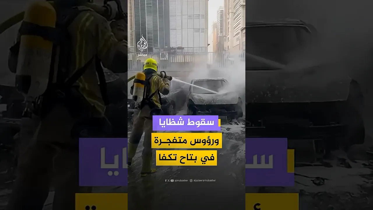 مشاهد لمحاولة الإطفاء الإسرائيلي التعامل مع احتراق عدد من السيارات في بتاح تكفا بتل أبيب جراء سقوط شظايا ورؤوس متفجرة