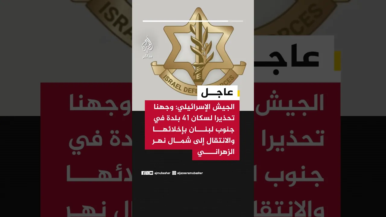 عاجل | الجيش الإسرائيلي: وجهنا تحذيرا لسكان 41 بلدة في جنوب لبنان بإخلائها والانتقال إلى شمال نهر الزهراني