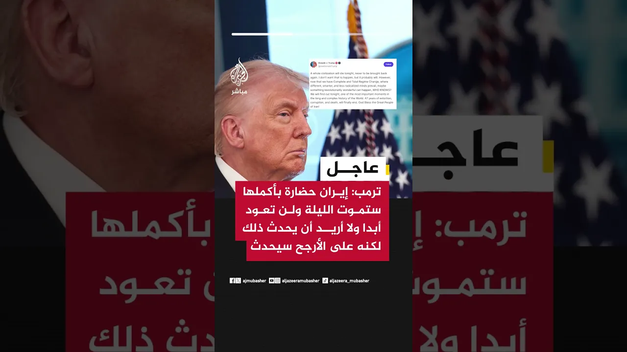 الرئيس الأميركي دونالد ترمب عن المهلة لـ إيران: حضارة بأكملها ستموت الليلة