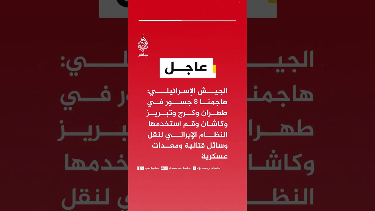 عاجل | الجيش الإسرائيلي: هاجمنا 8 جسور في طهران وكرج وتبريز وكاشان وقم استخدمها النظام الإيراني لنقل وسائل قتالية ومعدات عسكرية