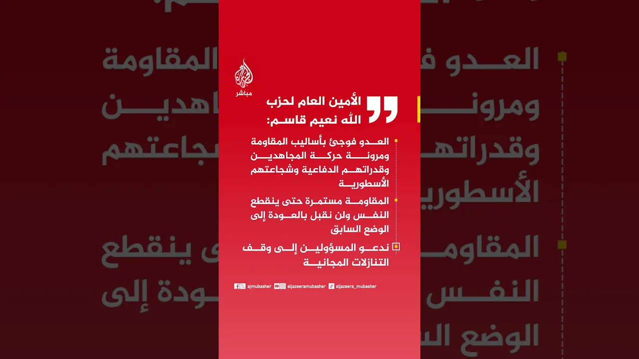 الأمين العام لحزب الله نعيم قاسم: ندعو المسؤولين إلى وقف التنازلات المجانية