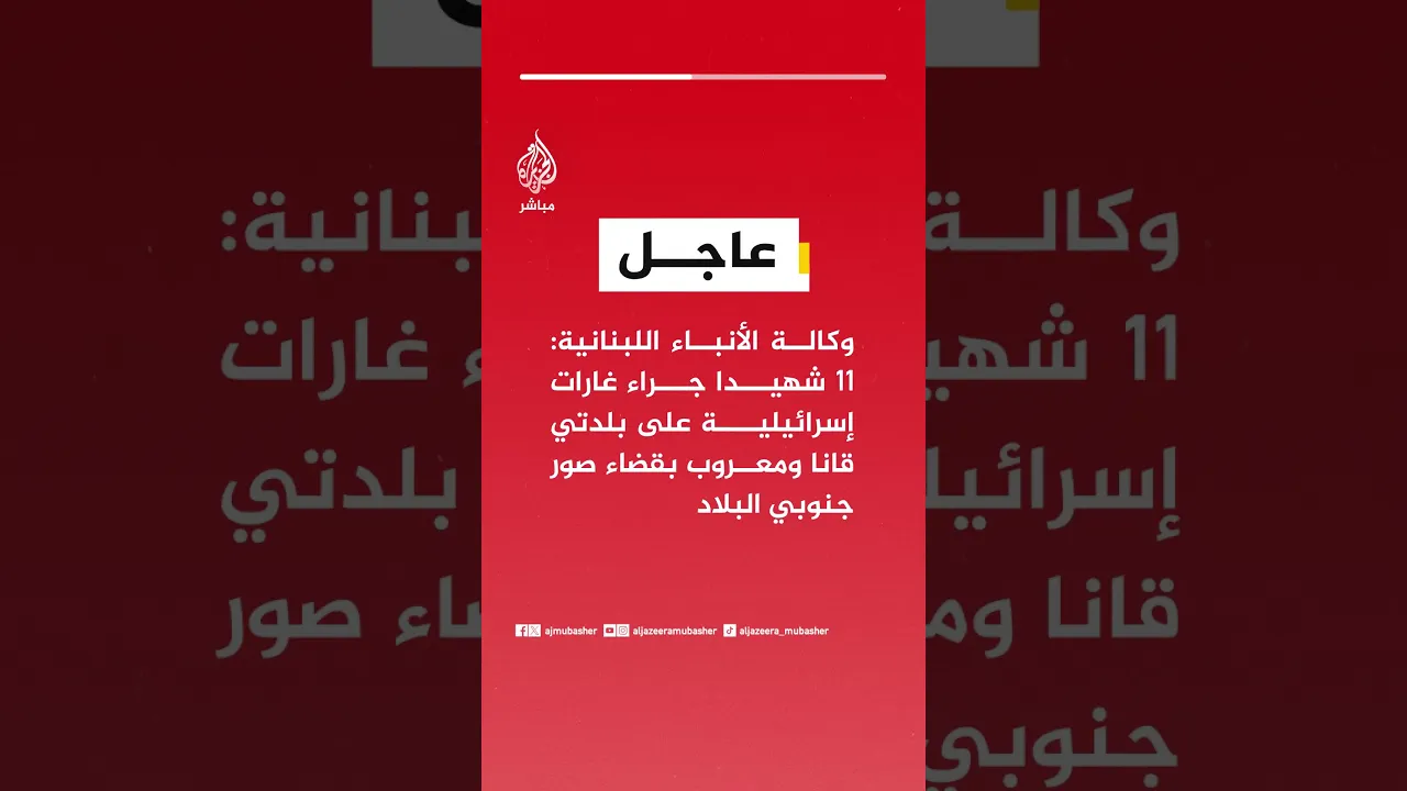 عاجل | وكالة الأنباء اللبنانية: 11 شهيدا جراء  غارات إسرائيلية على بلدتي قانا ومعروب بقضاء صور جنوبي البلاد