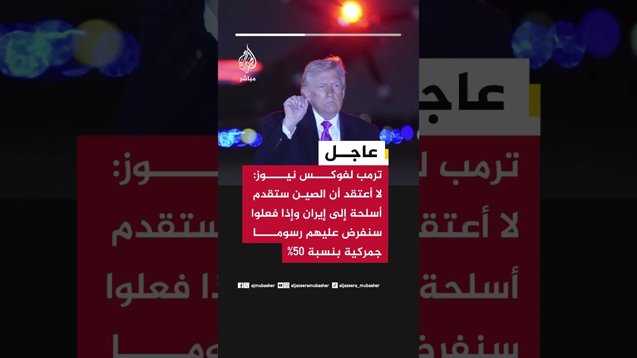 عاجل | ترمب لفوكس نيوز: لا أعتقد أن الصين ستقدم أسلحة إلى إيران وإذا فعلوا سنفرض عليهم رسوما جمركية بنسبة 50%