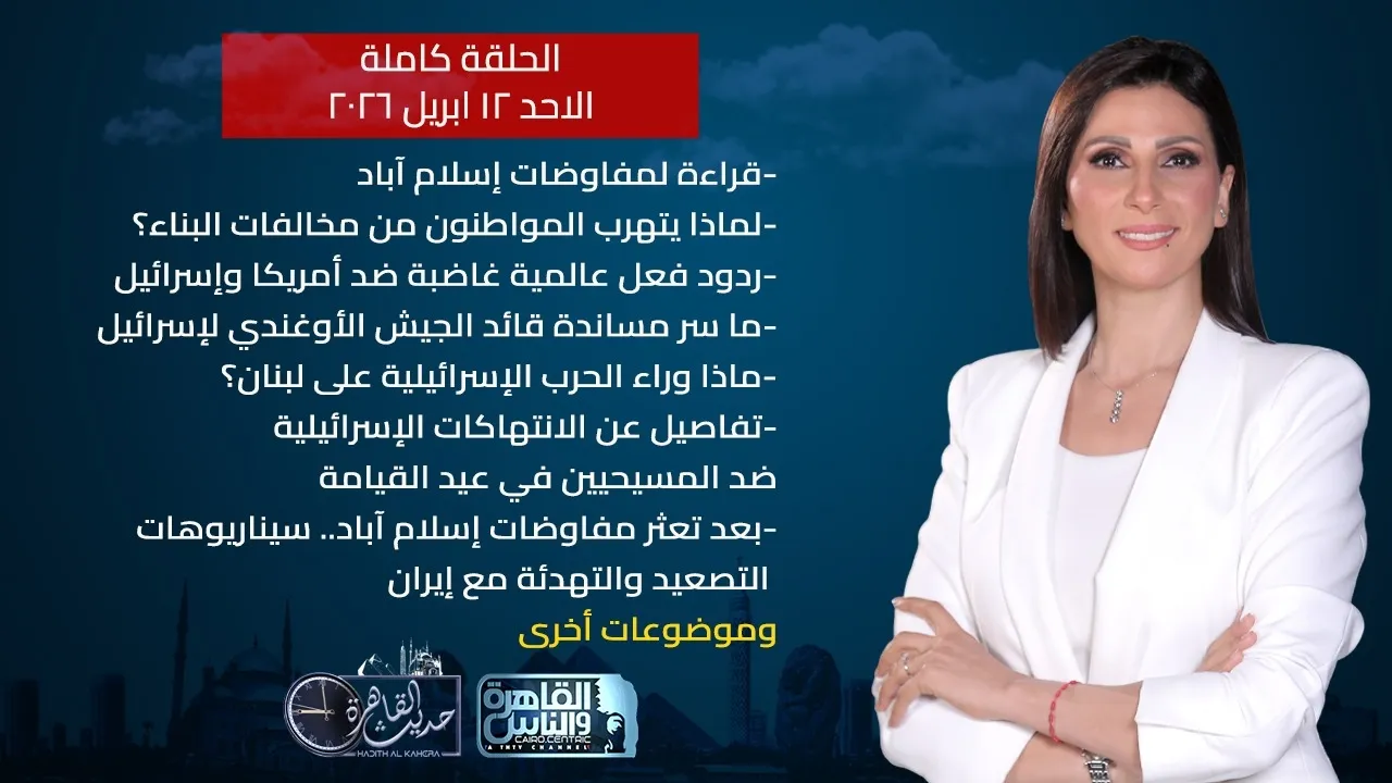 حديث القاهرة مع كريمة عوض| الحلقة الكاملة الأحد 12 إبريل 2026- هل نشهد التصعيد مجددا في الحرب الإيرانية؟- تفاصيل عن انتهاكات اسرائيل ضد المسيحيين في عيد القيامة- ما سر مساندة قائد الجيش الأوغندي لإسرائيل؟- لماذا يتهرب المواطنون من مخالفات البناء؟- لماذا يقحم نتنياهو أردوغان في حرب إيران ولبنان؟