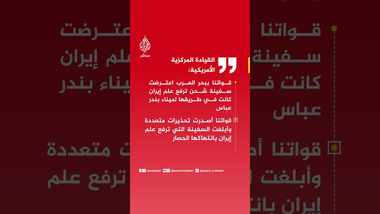 القيادة المركزية الأمريكية: قواتنا ببحر العرب اعترضت سفينة شحن ترفع علم إيران