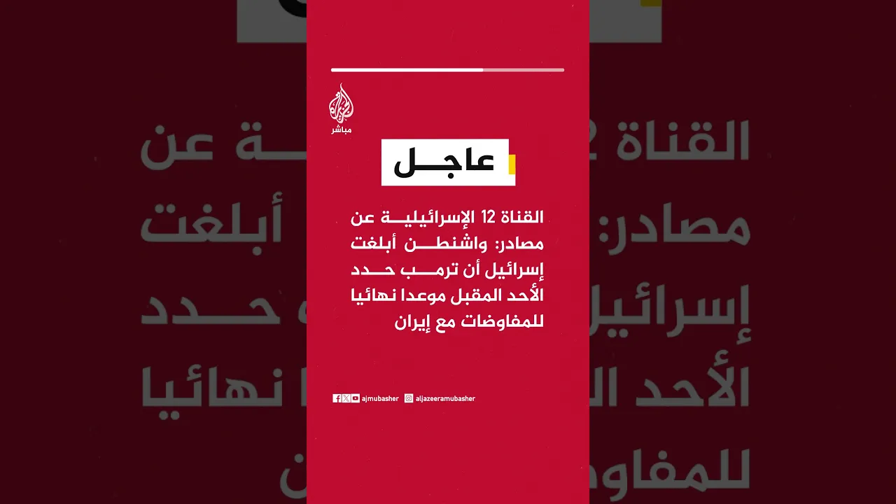 القناة 12 الإسرائيلية عن مصادر: واشنطن أبلغت إسرائيل أن ترمب حدد الأحد المقبل موعدا نهائيا للمفاوضات مع إيران