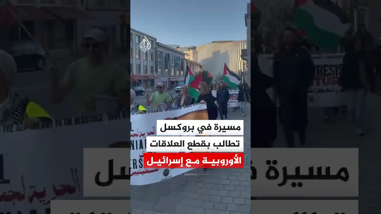 مسيرة في العاصمة البلجيكية بروكسل تطالب بقطع العلاقات الأوروبية مع إسرائيل٬ إذ رفع مشاركون لافتات تندد بالانتهاكات الإسرائيلية بحق الفلسطينيين