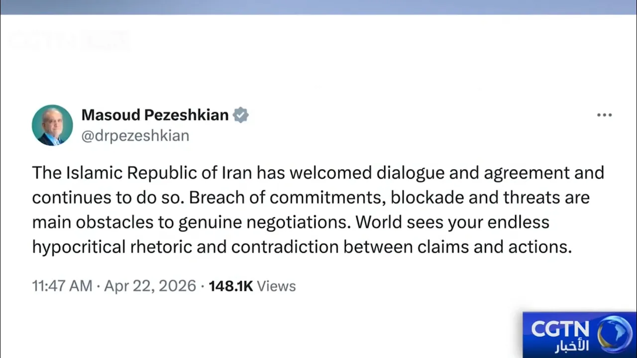قال الرئيس الإيراني مسعود بزشكيان إن الحصار الأمريكي على مضيق هرمز يمثل عقبة رئيسية أمام المفاوضات. واتهم الولايات المتحدة بانتهاك التزاماتها، مضيفا أن تهديدات واشنطن قوضت المفاوضات الجادة. كما قال رئيس البرلمان الإيراني محمد باقر قاليباف إن وقف إطلاق النار الشامل يكون ذا معنى فقط إذا لم يرافقه حصار بحري. وأشار إلى أن إعادة فتح المضيق لن تكون ممكنة إذا استمرت الولايات المتحدة في انتهاك وقف إطلاق النار.