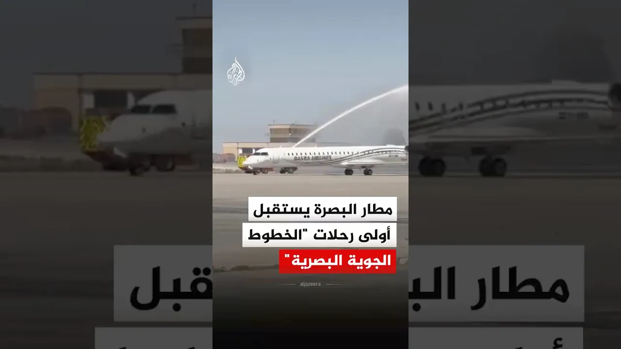 لحظة استقبال مطار البصرة أولى رحلات الخطوط الجوية البصرية القادمة من العاصمة العراقية بغداد حيث تم استقبال الطائرة بمدافع المياه احتفاء بتدشين الشركة لعملها