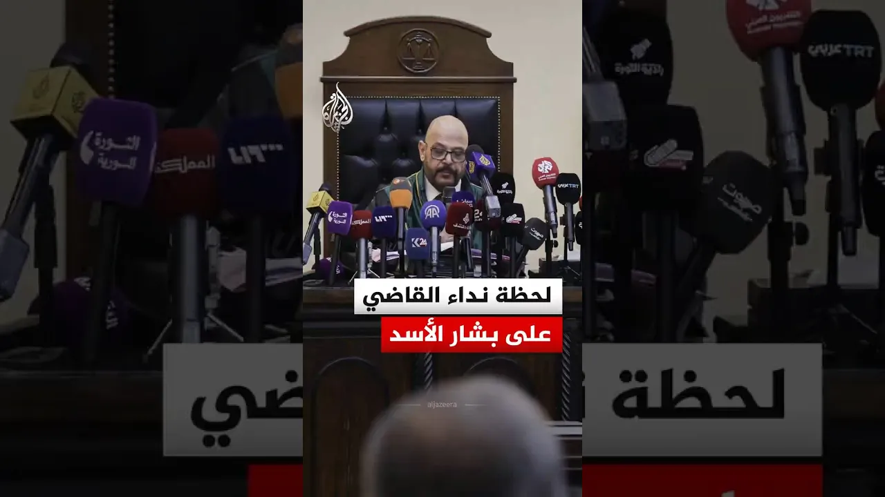 لحظة نداء القاضي على رئيس النظام السوري السابق بشار الأسد لمحاكمته التي تغيب عنها بعد هروبه من البلاد، وذلك في قاعة المحكمة التي تتم له ولرموز نظامه أبرزهم عاطف نجيب