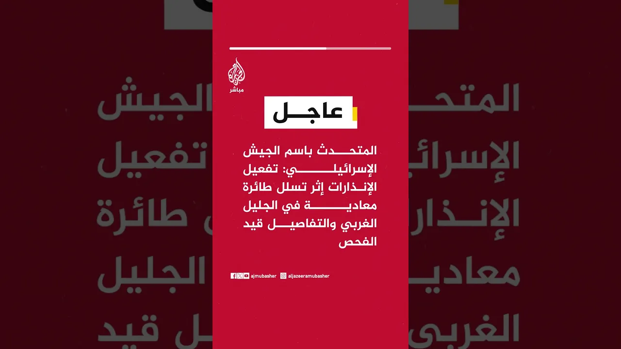عاجل | المتحدث باسم الجيش الإسرائيلي: تفعيل الإنذارات إثر تسلل طائرة معادية في الجليل الغربي والتفاصيل قيد الفحص